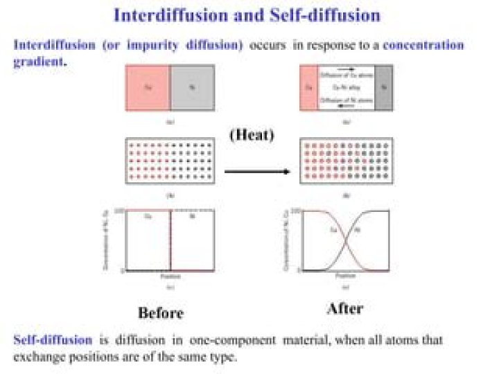 Interdiffusion (or impurity diffusion) occurs in response to a concentration. gradient. Self-diffusion is diffusion in one-component material, when all atoms that. exchange positions are of the same type.