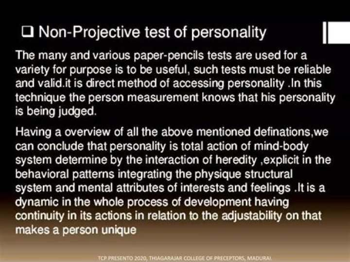 Personality tests are measures used to evaluate a person’s individual personality traits as well as psychological issues impacting them. In projective personality tests, the clinician exposes a subject to ambiguous stimuli and observes their response.