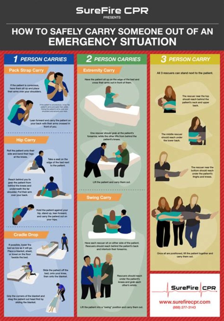 Lovers carry. Help them to walk if they can., Fireman’s carry. 6. Back strap carry.