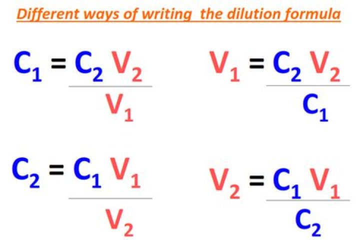 The formula for calculating a dilution is (C1) (V1) = (C2) (V2) where C1 is the concentration of the starting solution. V1 is the volume of the starting solution. C2 is the concentration of the final solution. V2 is the volume of the final solution.