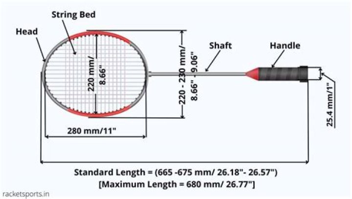 Badminton Rackets have an overall length of 26.18”-26.77” (665-680 mm), head width from 8.66”-9.06” (220-230 mm), and a handle diameter of 1” (25.4 mm). The mass of a modern Badminton Racket is between 2.46-3.35 oz (70-95 g).