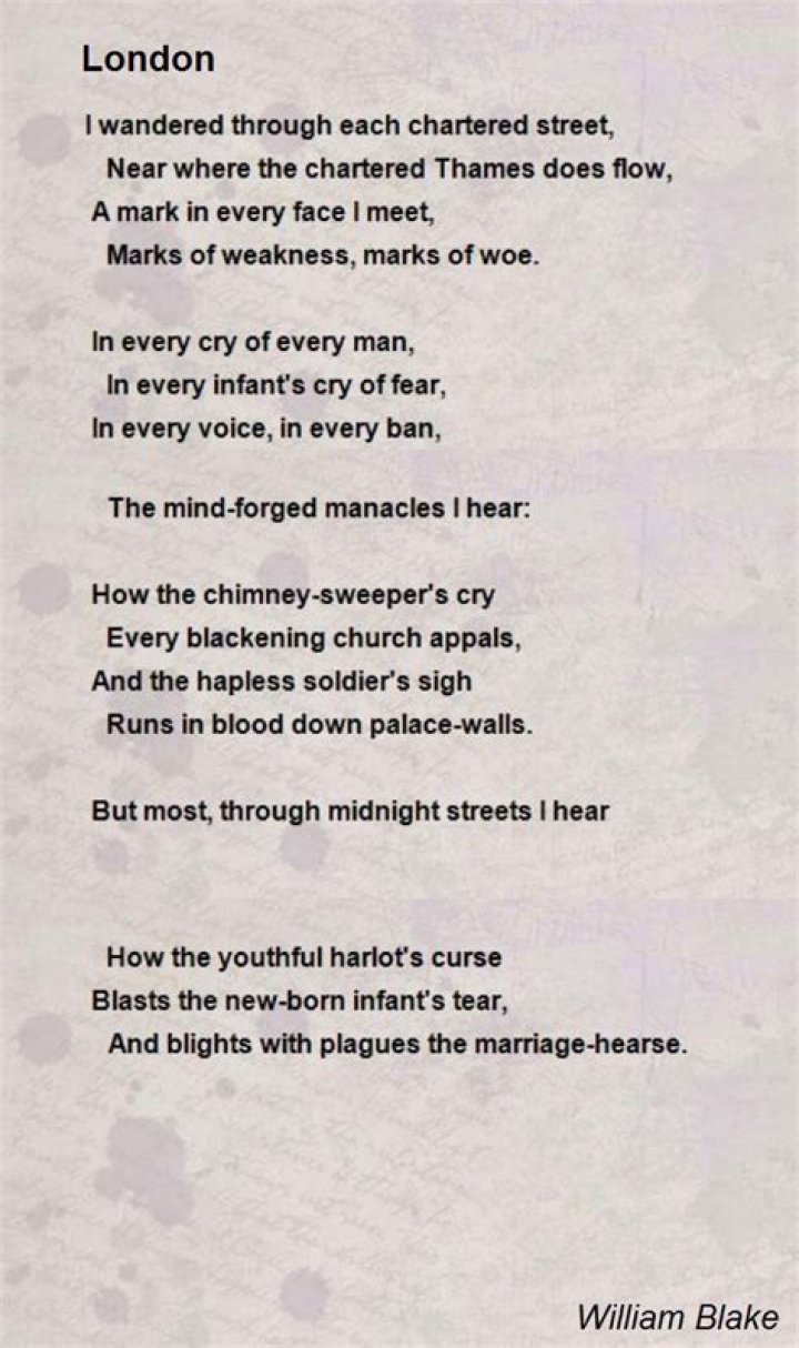 London’ by William Blake is a dark and dreary poem in which the speaker describes the difficulties of life in London through the structure of a walk. The speaker travels to the River Thames and looks around him. He takes note of the resigned faces of his fellow Londoners.