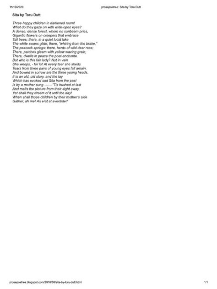 Written by Toru Dutt, Sita is a poem depicting the ordeal of a woman. A mother of three is trying to put her children to sleep. She tells them a story about a woman, Sita who was left behind her husband in a dense forest. She raised her two sons on her own.
