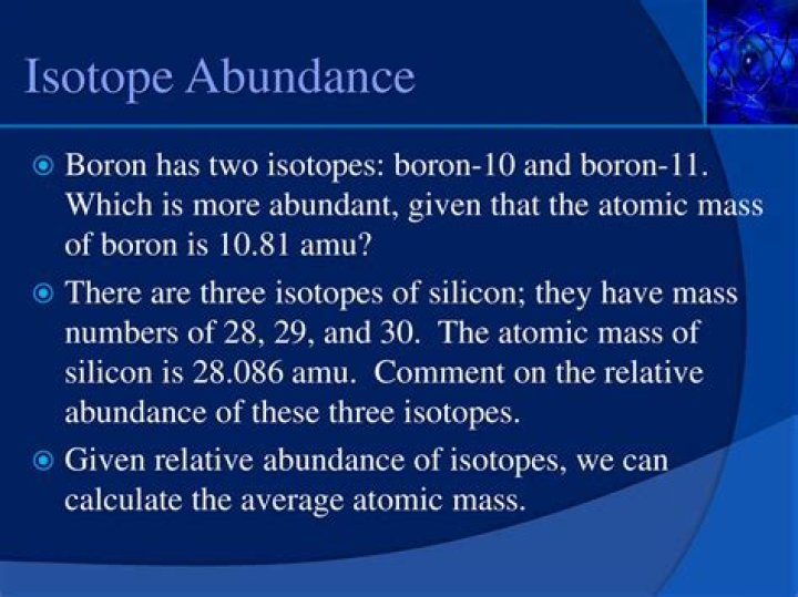 Example. There are two natural isotopes of boron: 10B and 11B. The natural abundance is 19.9% of 10B and 80.1% of 11B. Put another way, if you took a 100-gram sample of boron from anywhere on the planet, you could expect 19.9 grams to consist of boron-10 and 80.1 grams to consist of boron-11.