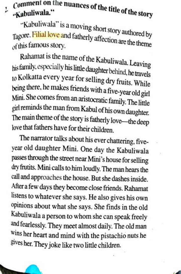 Answer: The Cabuliwallah” is a short story written by Rabindranath Tagore. The story involves the life of a cabuliwallah, a term that refers to a fruit seller from Kabul, named Rahaman. The story’s main themes are the relationship between a father and daughter and the struggles of adjusting to a new place.