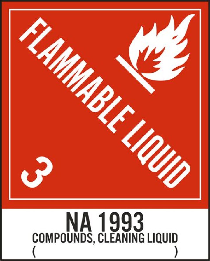 Pre-numbered with 4-digit identification number (UN 1992), hazard class (3) and DOT-required symbol. Use hazmat placards for shipping flammable liquid (toxic, n.o.s.) Flammable liquid placard measures 10-3/4″ x 10-3/4″