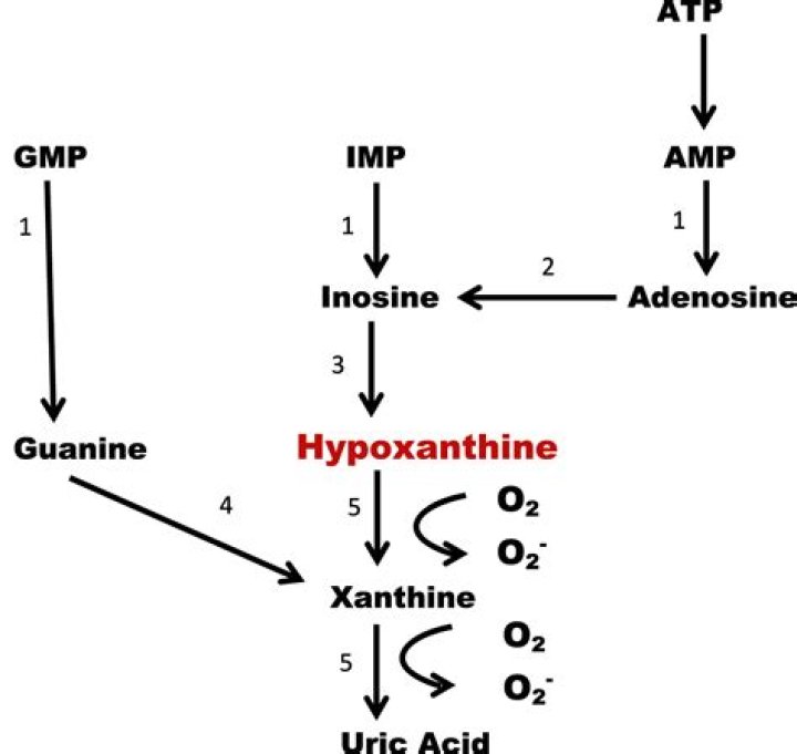 Unsalvaged hypoxanthine is oxidized to xanthine, which is further oxidized to uric acid by xanthine oxidase. Molecular oxygen, the oxidant in both reactions, is reduced to H2O2 and other reactive oxygen species. In humans, uric acid is the final product of purine degradation and is excreted in the urine.
