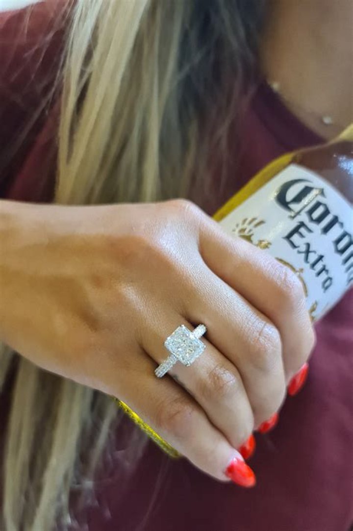 This radiant cut diamond is estimated to be around 6 carats, set in platinum or white gold with a hidden diamond halo and at least one carat of accent diamonds set into the ring itself.