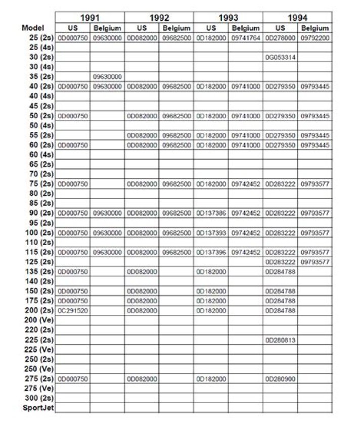 Compare the serial number on your outboard to the numbers on the chart and find the two serial numbers between which your serial number lies. The year your outboard was manufactured will be the year displayed with the lower of the two numbers.