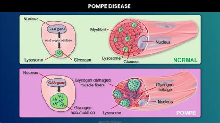 In Pompe disease, mutations in the GAA gene reduce or completely eliminate this essential enzyme. Excessive amounts of lysosomal glycogen accumulate everywhere in the body, but the cells of the heart and skeletal muscles are the most seriously affected.