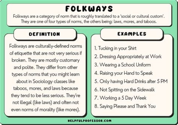 Folkways are informal rules and norms that, while not offensive to violate, are expected to be followed. Mores (pronounced more-rays) are also informal rules that are not written, but, when violated, result in severe punishments and social sanction upon the individuals, such as social and religious exclusions,.