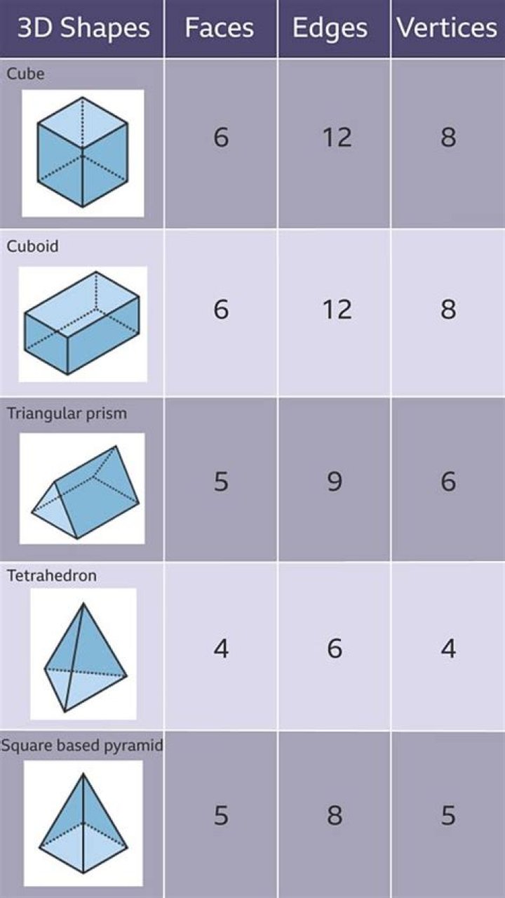 5 Faces. 6 Vertices (corner points) 9 Edges.