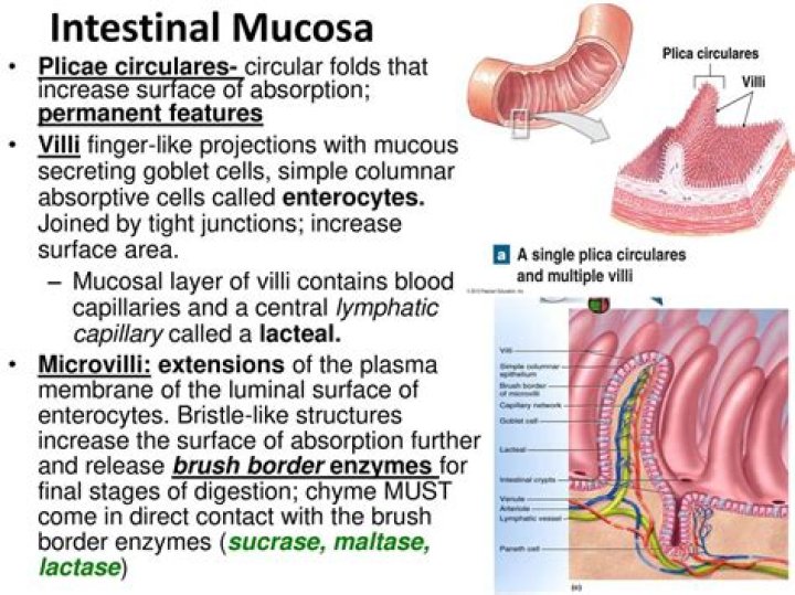 The lining of the small intestinal mucosa is very highly specialized for maximizing digestion and absorption of nutrients. The lining is highly folded to form microscopic finger-like projections called villi which increase the surface area to help with absorption.