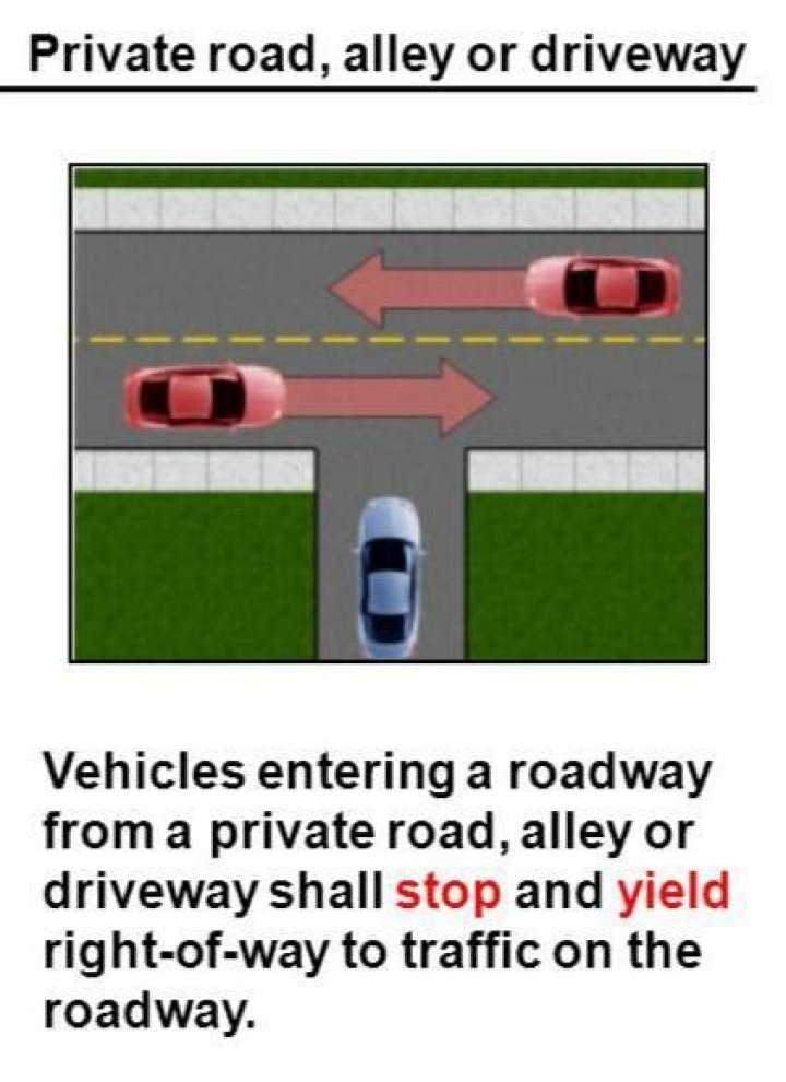 If you are entering a paved thoroughfare from a private road, a driveway, or an unpaved road, you are required to stop your vehicle and then give the right-of-way to pedestrians and other vehicles.