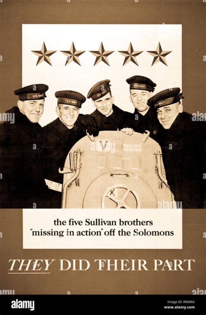 All five brothers were killed when their ship was sunk by a Japanese sub. The death of the five Sullivan brothers was impossible to imagine. So horrible it forced the U.S. War department to adopt “The Sole Survivor Policy” so it would never happen again.