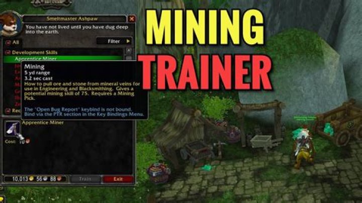 Unfortunately, mining is learned in Stormwind, which is located to the northwest if you follow the main road there. Inside Elwynn Forest you can also find the alchemist and herbalist trainers, to theeast of the Stormwind entrance. There is also a tailor found along the road to the east from Goldshire.