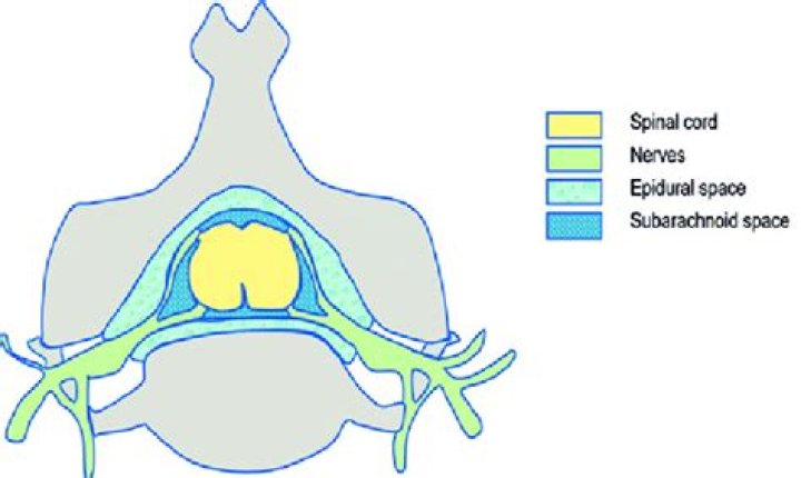 The epidural space is located within the vertebral column and extends from the foramen magnum to the sacral hiatus. Its main anatomic delineations are the tough dura mater, which is the outermost covering of the spinal cord, and the vertebral periosteum.