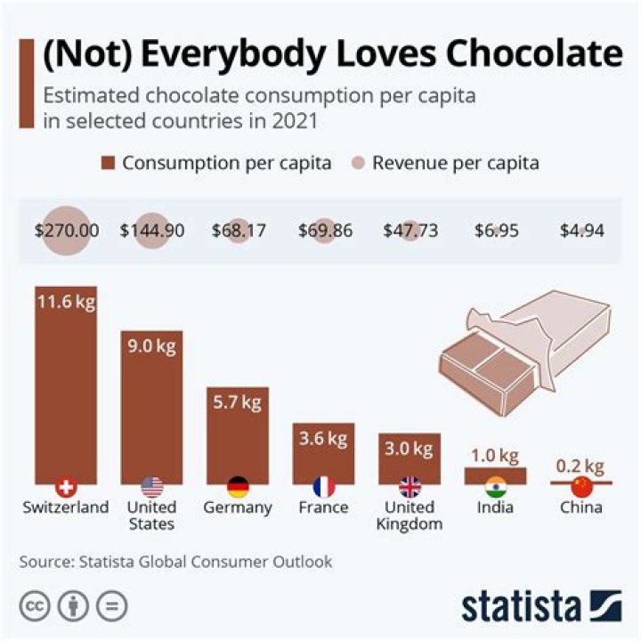 In 2017, Switzerland was the highest consumer of chocolate per capita, with an average of 8.8 kg consumed per person.