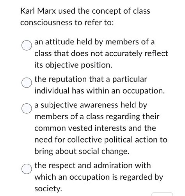 proletariat consciousness. Which term is used by Karl Marx to refer to an attitude held by members of a class that does not accurately reflect the class’s objective position? A. bourgeoisie consciousness.