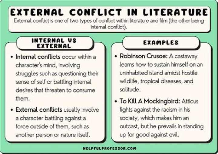 Internal conflict is when a character struggles with their own opposing desires or beliefs. It happens within them, and it drives their development as a character. External conflict sets a character against something or someone beyond their control.