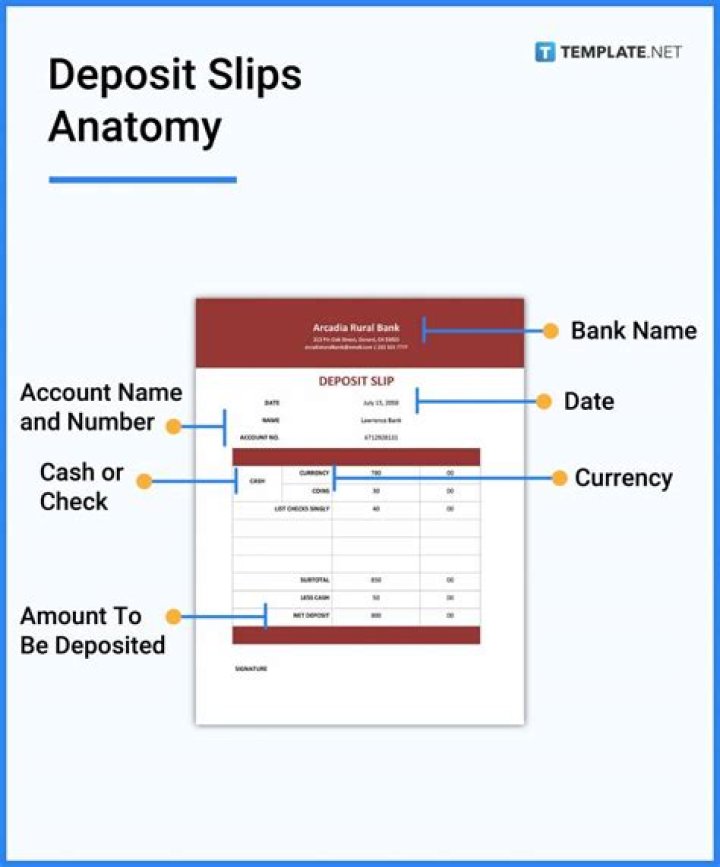A deposit slip is a small paper form that a bank customer includes when depositing funds into a bank account. A deposit slip, by definition, contains the date, the name of the depositor, the depositor’s account number, and the amounts being deposited.
