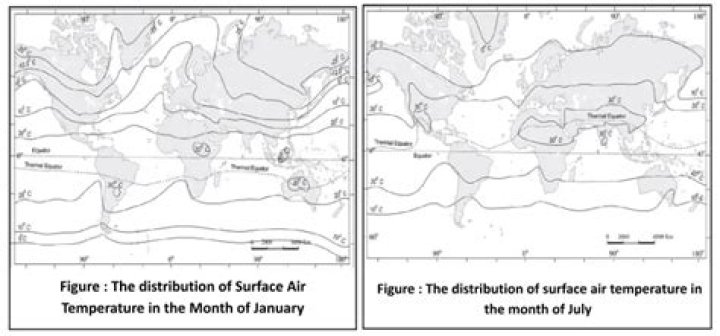 Generally follow the parallels: Isotherms have close correspondence with the latitude parallels mainly because the same amount of insolation is received by all the points located on the same latitude. Narrow spacing between isotherms indicate rapid change in temperature (high thermal gradient).
