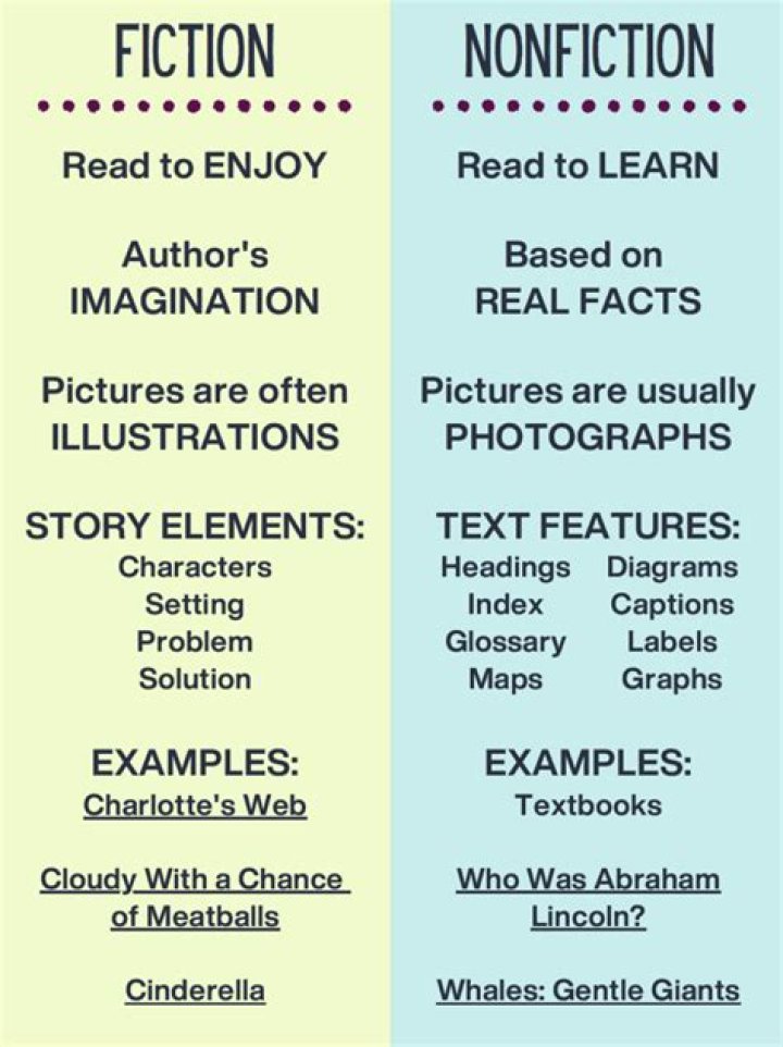 “Fiction” refers to literature created from the imagination. “Nonfiction” refers to literature based in fact. It is the broadest category of literature.