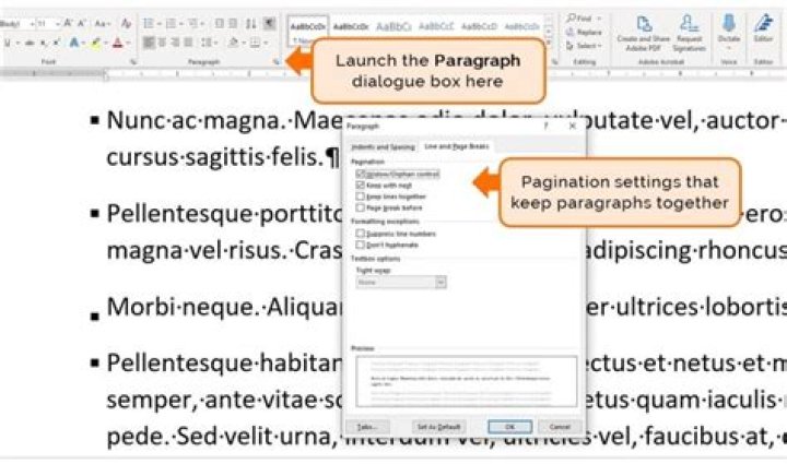 “Widow/Orphan control” prevents a single line of a paragraph from being left alone at the top or bottom of a page. This property is enabled by default for all styles in Word. “Keep lines together,” as the name implies, keeps all the lines of a paragraph together.
