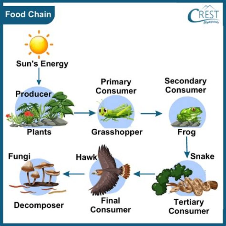 Each living thing is a part of multiple food chains – for example, grass is a part of the food chain: grass → grasshopper → frog → snake → eagle, and also of the food chain: grass → deer → tiger. All of the interconnected and overlapping food chains in a habitat make up a food web.